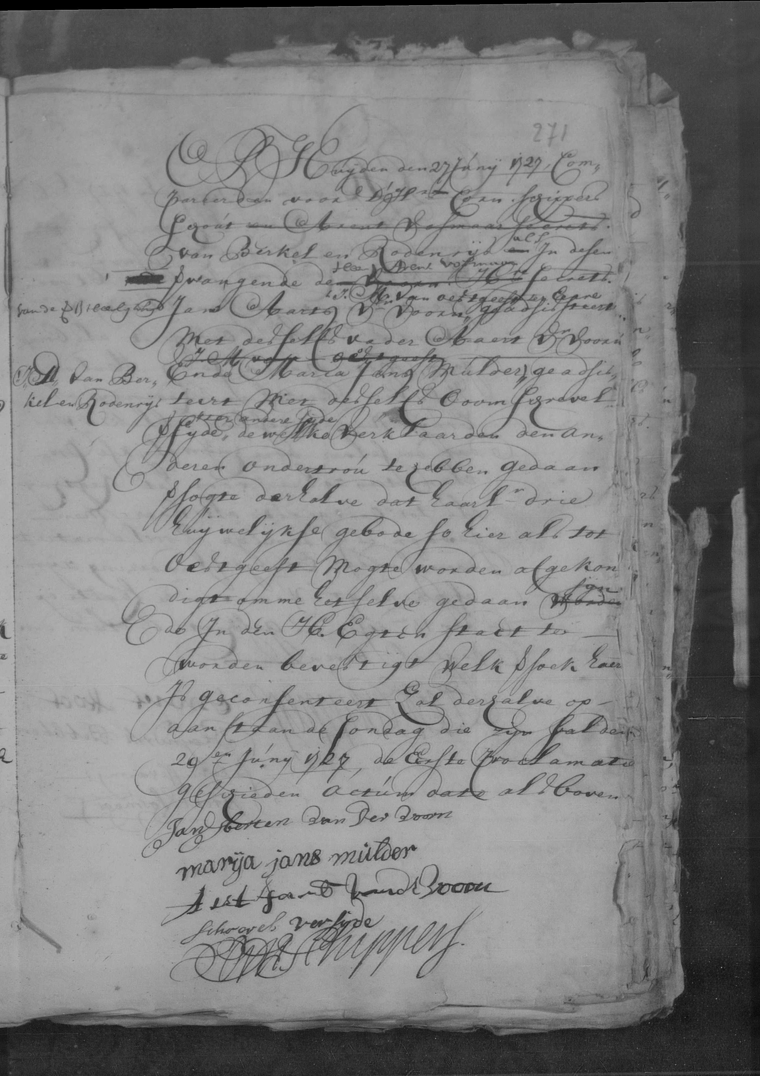 Ondertrouwakte Jan Arendze van der Voorn en Maria Jans Mulder. Berkel en Rodenrijs 27-6-1727