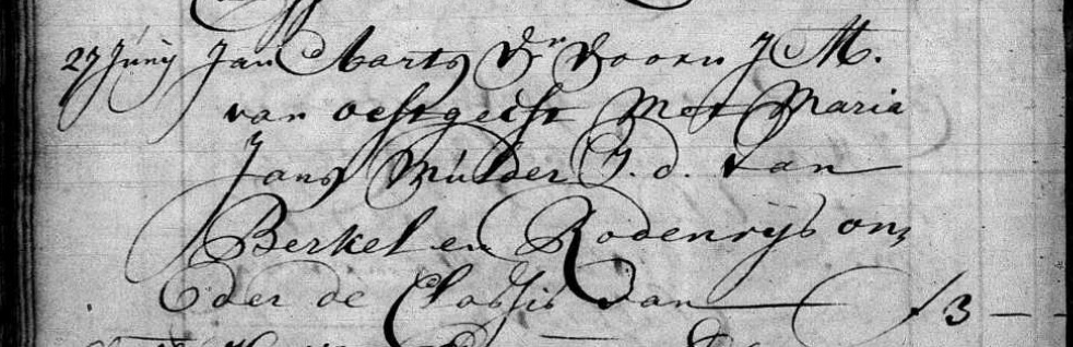 Ondertrouwregister Berkel en Rodenrijs onder de Tempel. Jan Arendze van der Voorn en Maria Jans Mulder. 27-6-1727