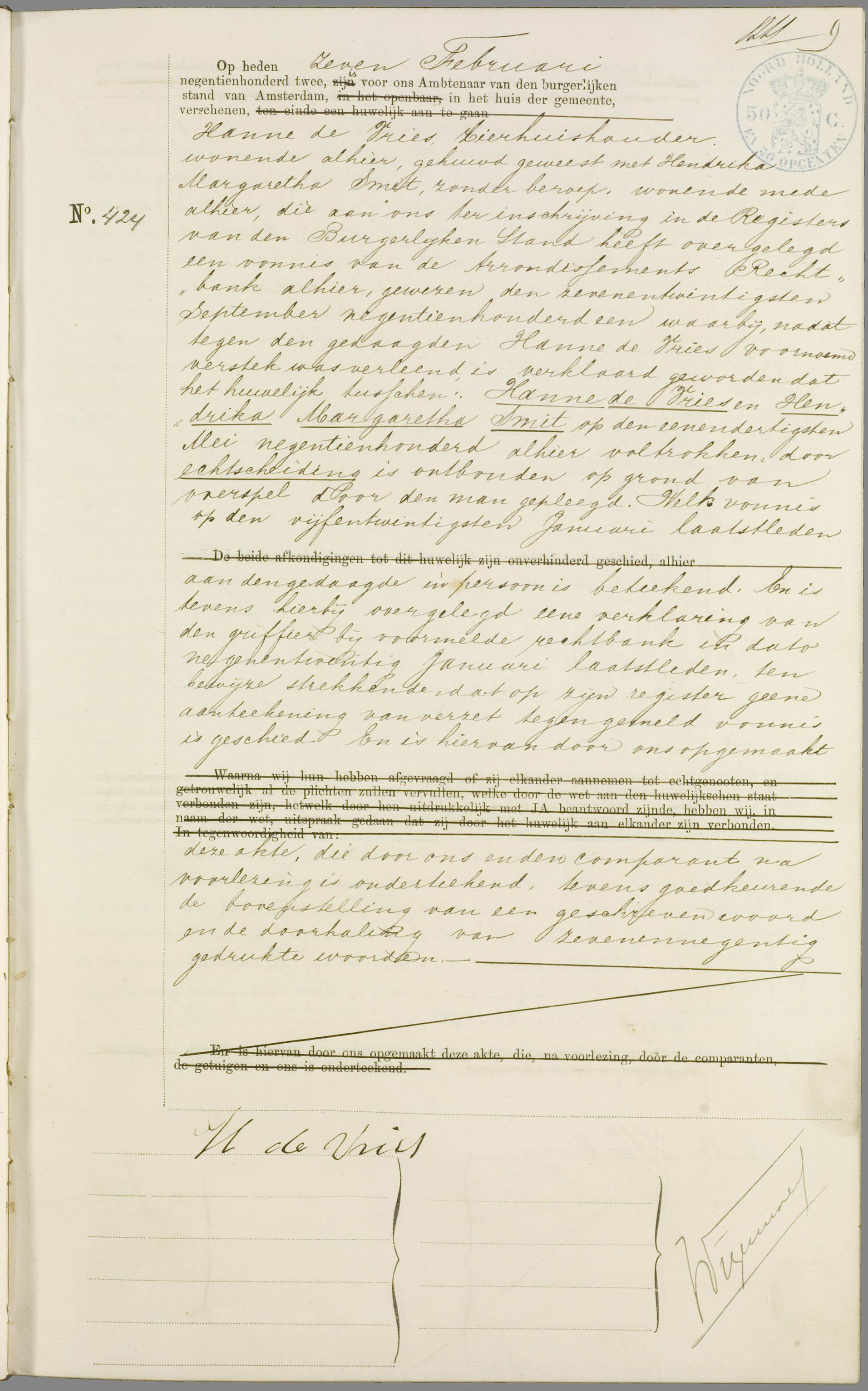 Huwelijksakte Hanne de Vries en Hendrika Margaretha Smit Amsterdam 31-5-1900