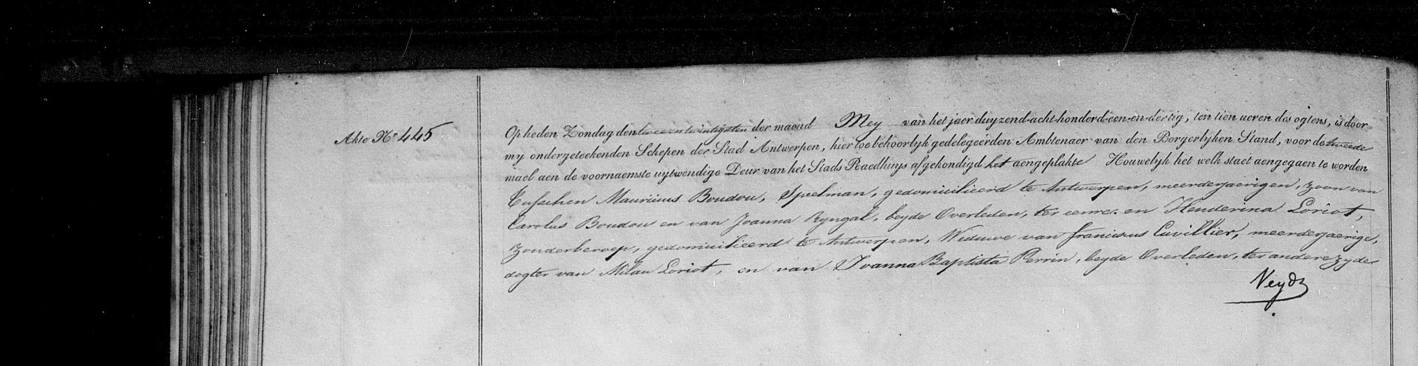 Huwelijksakte Maurice Boudou en Hendrina Loriot 22-5-1831 Antwerpen