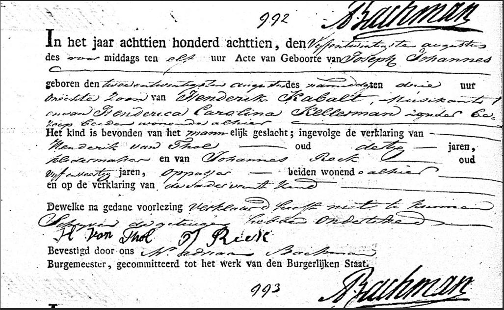 | Doop van een zoon | Josephus Joannes Cabalt (Kabalt) 22 augustus 1818 (Leeftijd 22 jaar) Adres: Frankrijkskerk Religie: Rooms-katholiek |