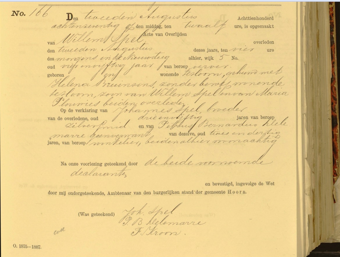 | Overlijden van een echtgenoot | Willem Spel 2 augustus 1878 (Leeftijd 51 jaar) Adres: Nieuwsteeg, wijk 5. |