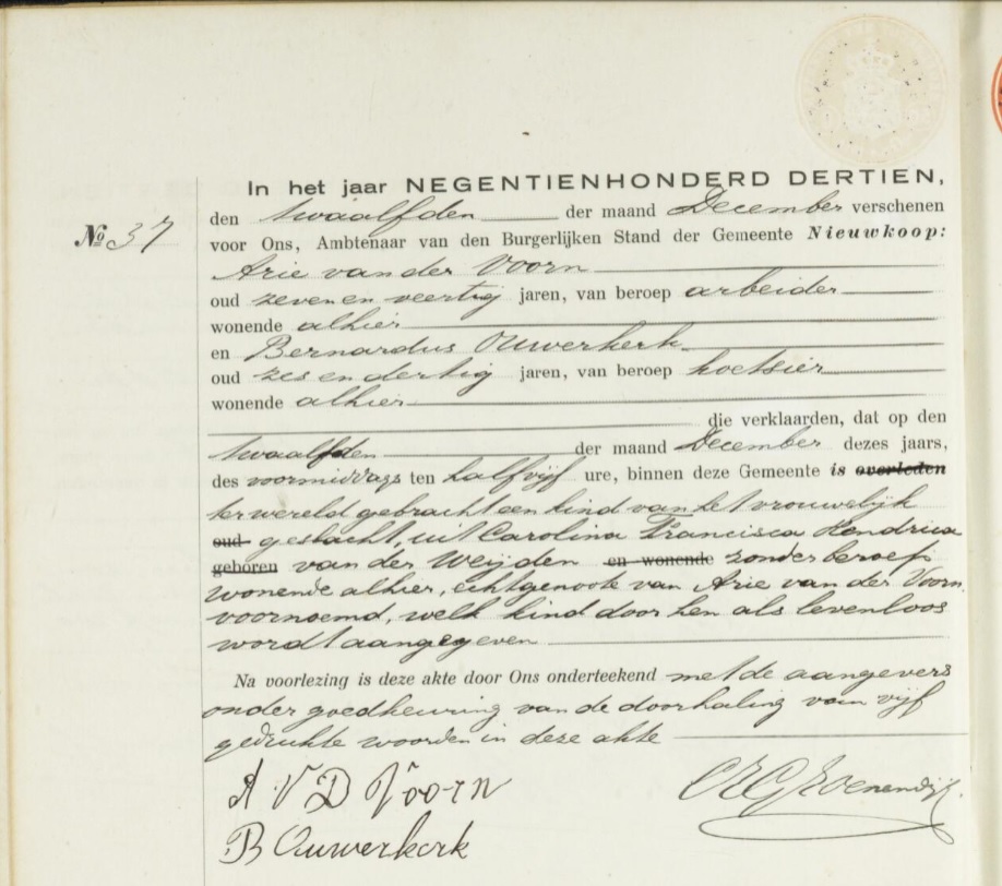 … van der Voorn Geboren: 12 december 1913 47 35 — Nieuwkoop (Z-H) Overleden: 12 december 1913 — Nieuwkoop (Z-H) |