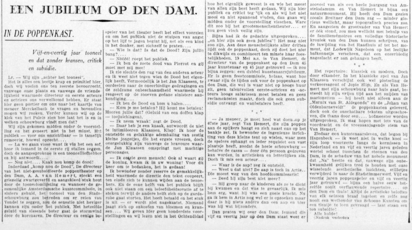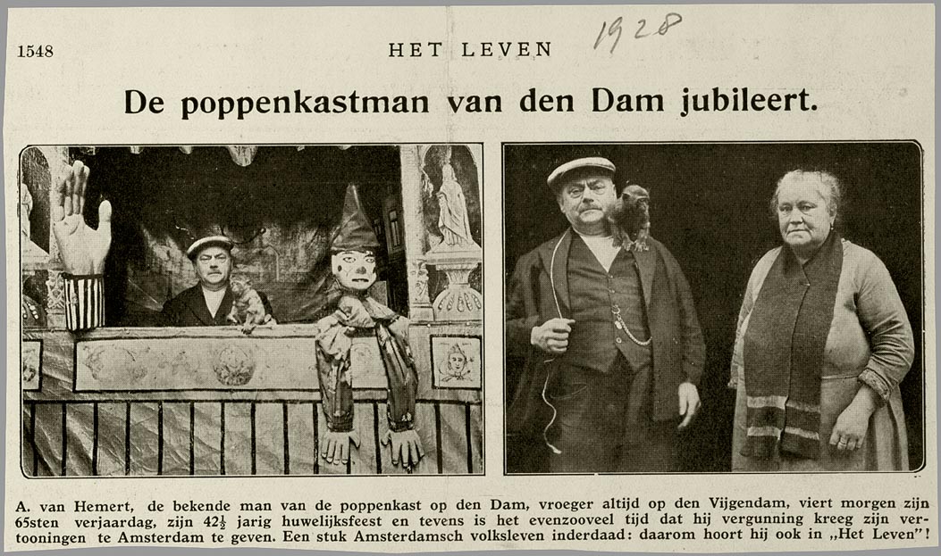 | Media object | Formaat: image/jpeg Afmetingen afbeelding: 775 × 503 pixels Bestandsgrootte: 70 KB Soort: Foto Notitie: Poppenkastspeler A.A. van Hemert in zijn poppenkast in Amsterdam. 1930-1935 |