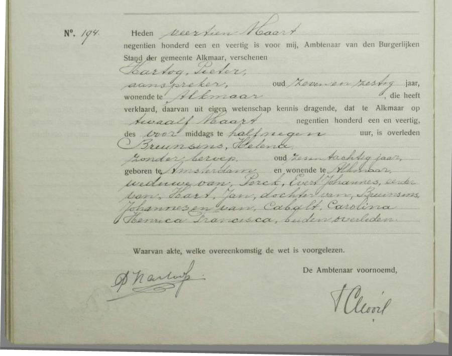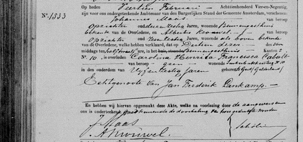 | Overlijden van moeder | Carolina Henrica Francisca ‘Ciska’ Cabalt (Kabalt) 13 februari 1894 – 11:30 (Leeftijd 30 jaar) Leeftijd: 65 Adres: Binnengasthuis. Kanton 2, nr 10 |