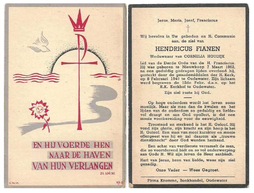 Hendricus Vianen (Fianen) Geboren: 7 maart 1862 43 34 — Nieuwkoop (Z-H) Overleden: 8 februari 1949 — Oudewater (Utrecht) |