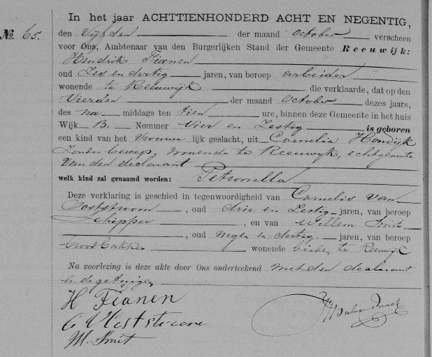 | Geboorte van een dochter #4 | Petronella Vianen (Fianen) 4 oktober 1898 (Leeftijd 36 jaar) Adres: Wijk B, nr. 64 |