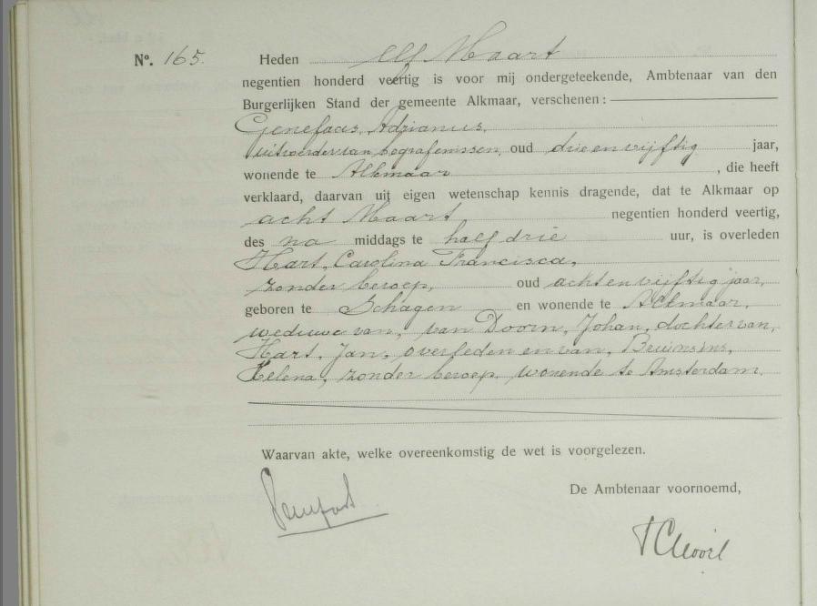 | Geboorte van een dochter #4 | Carolina Francisca Hart 26 januari 1882 (Leeftijd 27 jaar) Bron: www.archiefalkmaar.nl Tekst: Hart Carolina Francisca geregistreerde Alkmaar 26-01-1882 BR inschrijving