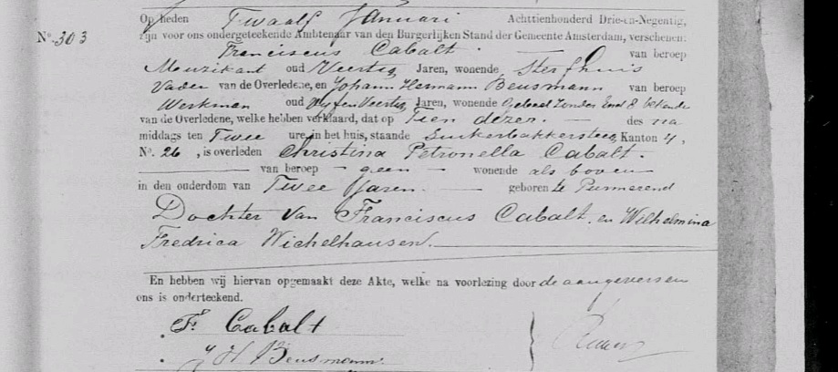 | Overlijden van een zus | Christina Petronella Cabalt (Kabalt) 10 januari 1893 – 02:00 (Leeftijd 6 jaar) Adres: Suikerbakkersteeg. Kanton 4, nr. 26. |