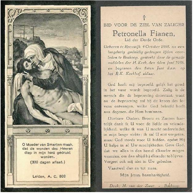 Petronella Vianen (Fianen) Geboren: 4 oktober 1898 36 34 — Reeuwijk (Z-H) Overleden: 4 juni 1936 — Boskoop (Z-H) |