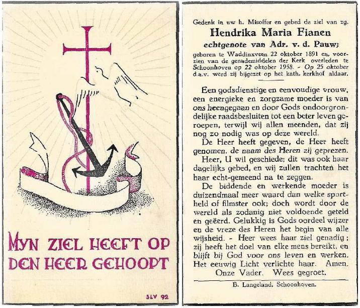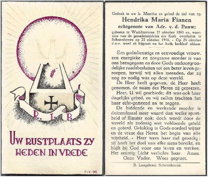 Hendrika Maria Vianen (Fianen) Geboren: 22 oktober 1891 29 27 — Waddinxveen (Z-H) Overleden: 22 oktober 1958 — Schoonhoven (Z-H) |