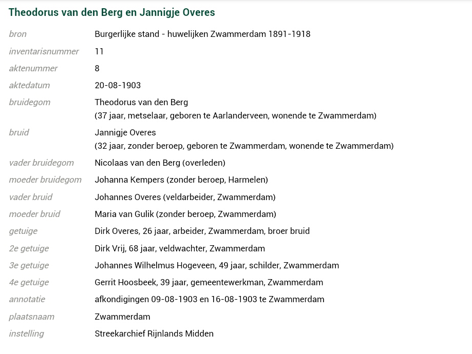 | Huwelijk van een broer/zus | Theodorus van den Berg — Jannigje Overes — Bekijk dit gezin 20 augustus 1903 (Leeftijd 28 jaar) |