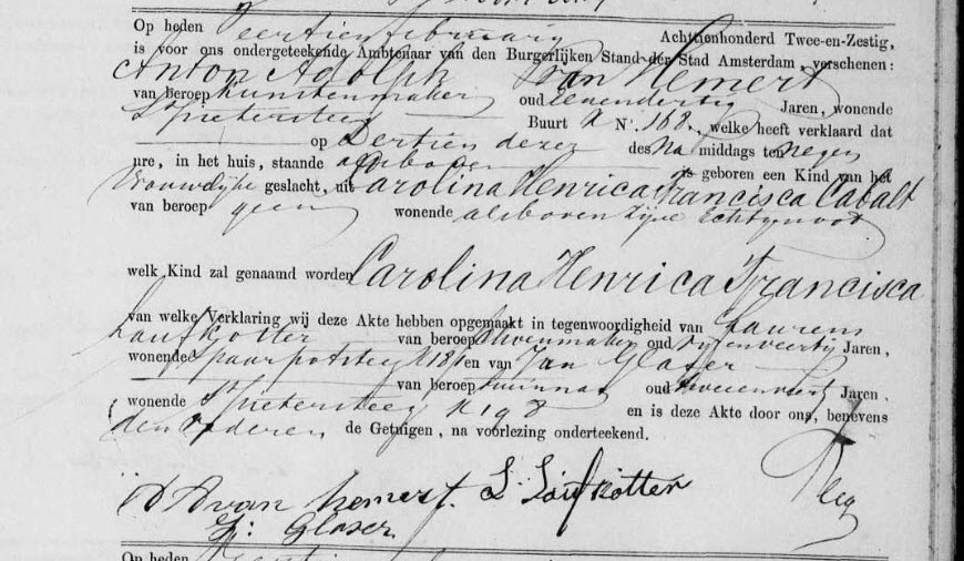 | Geboorte van een kleindochter #2 | Carolina Henrica Francisca van Hemert 13 februari 1862 – 21:00 (Leeftijd 44 jaar) Adres: Sint Pietersteeg nr. 168 |