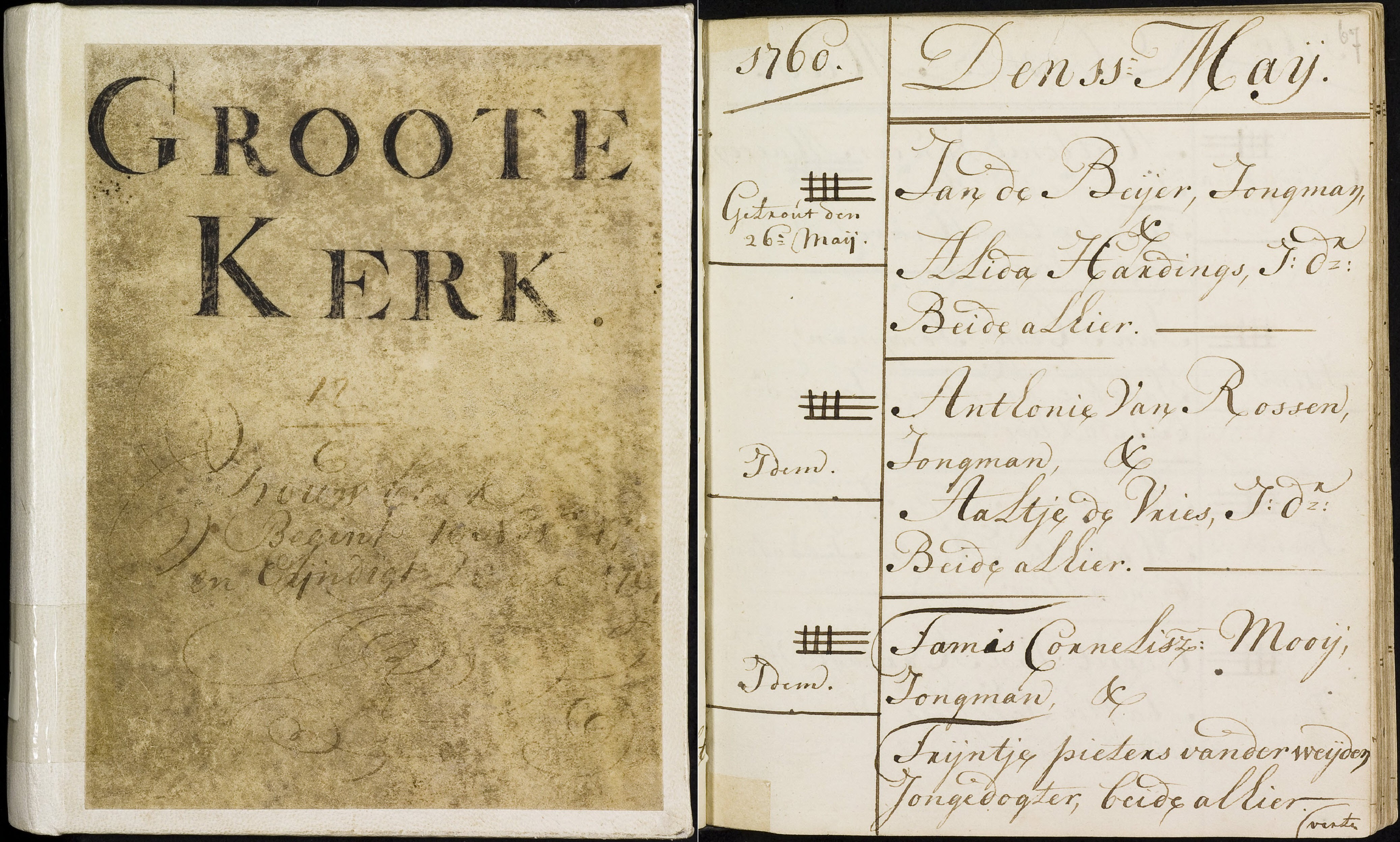 | Huwelijk van een kind | Tamis Cornelisz Mooij (Mooy) — Trijntje van der Weijde — Bekijk dit gezin Soort: Kerkelijk huwelijk 26 mei 1760 (Leeftijd 55 jaar)Adres: GROOTE KERK |