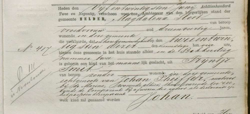 | Geboorte van een kleinzoon #1 | Johan Pheiffer 22 juni 1892 – 16:00 Adres: Bakkersteeg nr. 2 |