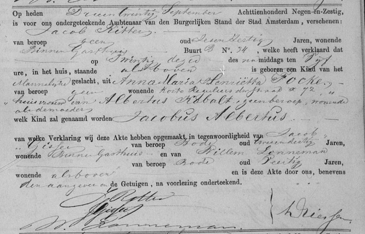 | Geboorte van een kleinzoon #2 | Jacobus Albertus ‘Janus’ Cabalt (Kabalt) 20 september 1869 – 17:00 uur (Leeftijd 54 jaar) Adres: Korte Reguliersdwarsstraat 72a