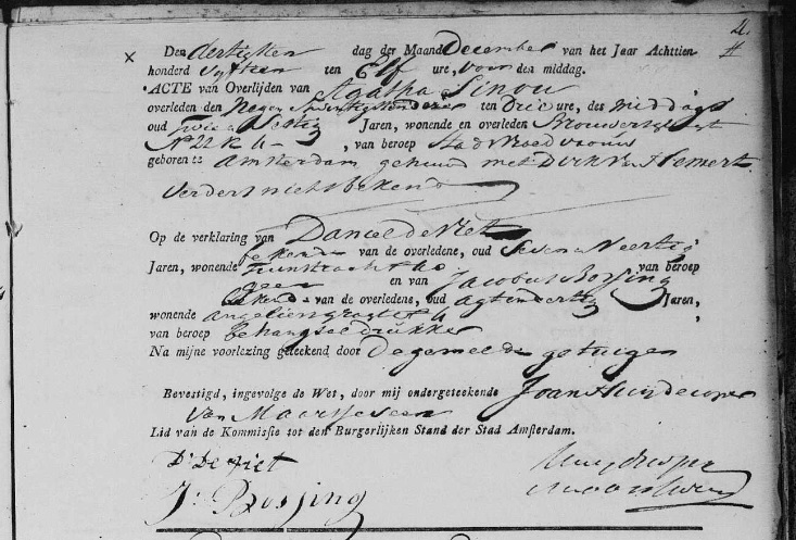 | Overlijden van moeder | Agetha Sinou 29 december 1815 (Leeftijd 30 jaar) Adres: Brouwersgracht |