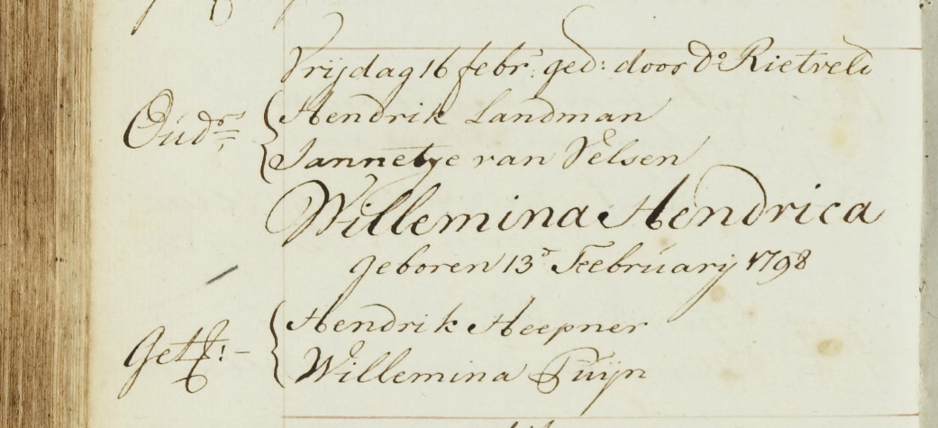 | Doop van een zus | Willemina Hendrica Landman 16 februari 1798 (Leeftijd 15 maanden) Adres: Oude Kerk Religie: Hervormd |