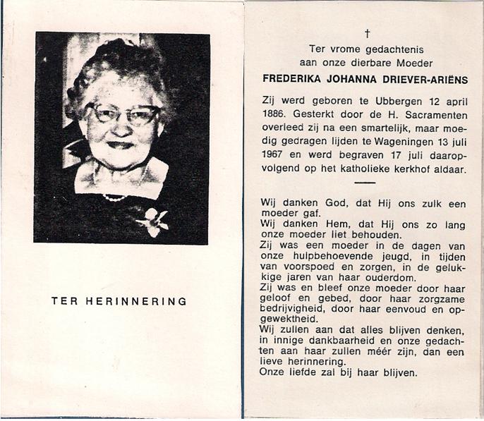 | Begrafenis van een echtgenoot | Gerardus Bartholomeus Driever 18 augustus 1953 (Leeftijd 67 jaar) Begraafplaats: R.K. Kerkhof |