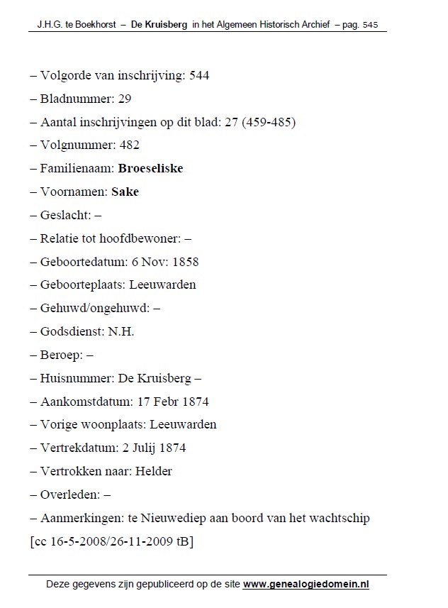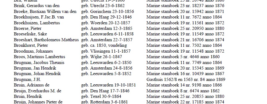 | Woonplaats | 2 juli 1874 (Leeftijd 15 jaar) Adres: Het Nieuwediep. Aan boord van het Wachtschip. |