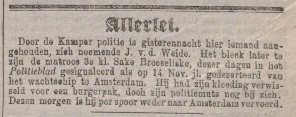 Sake Broeseliske Geboren: 6 november 1858 36 31 — Leeuwarden (Friesland) Overleden: 22 augustus 1894 — Rotterdam (Z-H) |
