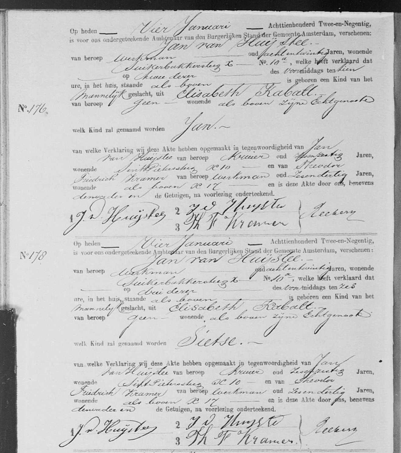 | Geboorte van een zoon #4 | Jan van Huijstee 2 januari 1892 – 10:00 (Leeftijd 28 jaar) Adres: Suikerbakkersteeg 10 |