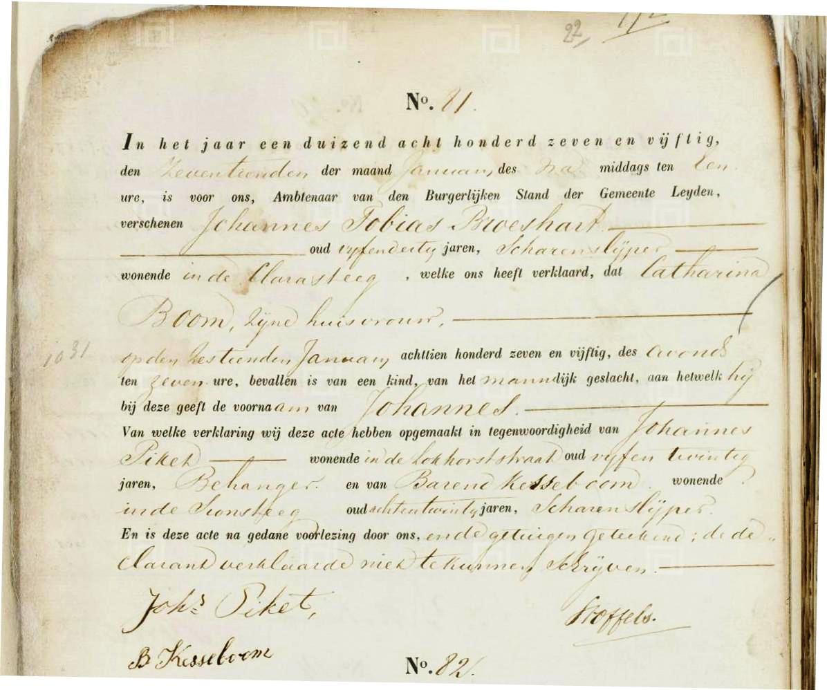 | Geboorte van een zoon #8 | Johannes Jacobus Broeshart 23 december 1857 (Leeftijd 36 jaar) Adres: Clarasteeg |