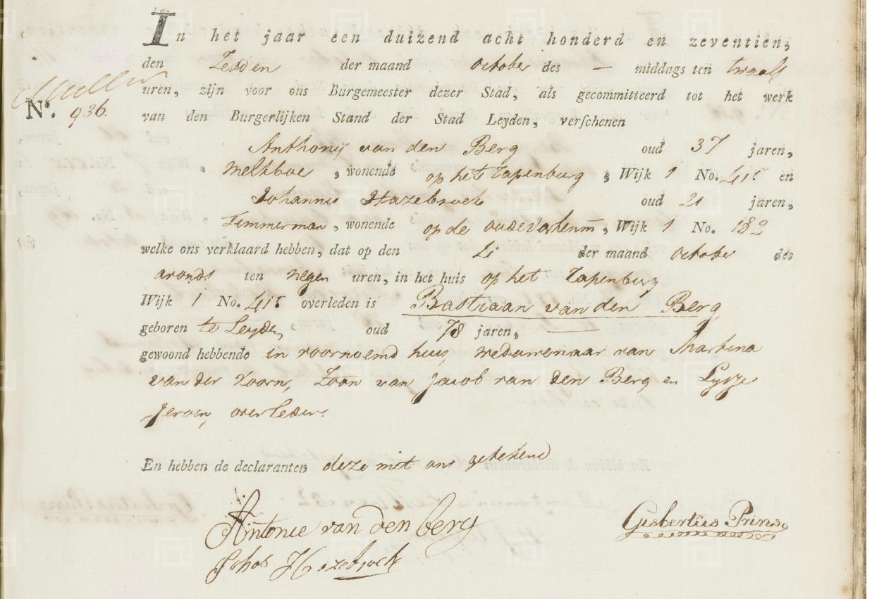 | Overlijden van vader | Bastiaan (Sebastianus) van den Berg (Bergh) 4 oktober 1817 (Leeftijd 48 jaar) Leeftijd: 78 Adres: Rapenburg, wijk 1, nr. 415 Getuige: Antonie ‘Anthony’ van den Berg — zoon |