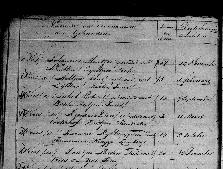 | Marriage of a child | Jacob Pieters de Vries — Antien (Antje Jans) Menger (Bosch) (Prop) — View this family September 7, 1815 (Age 52 years) Husband: 22 Wife: 19 Note: Huwelijksregister 1815 Noordwolde, archiefnummer 30-41, Burgerlijke Stand Weststellingwerf - Tresoar… |