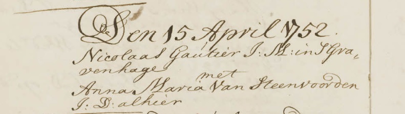 Ondertrouw Nicolaas Gautier en Anna Maria van Steenvoorden 15-4-1752 Delft