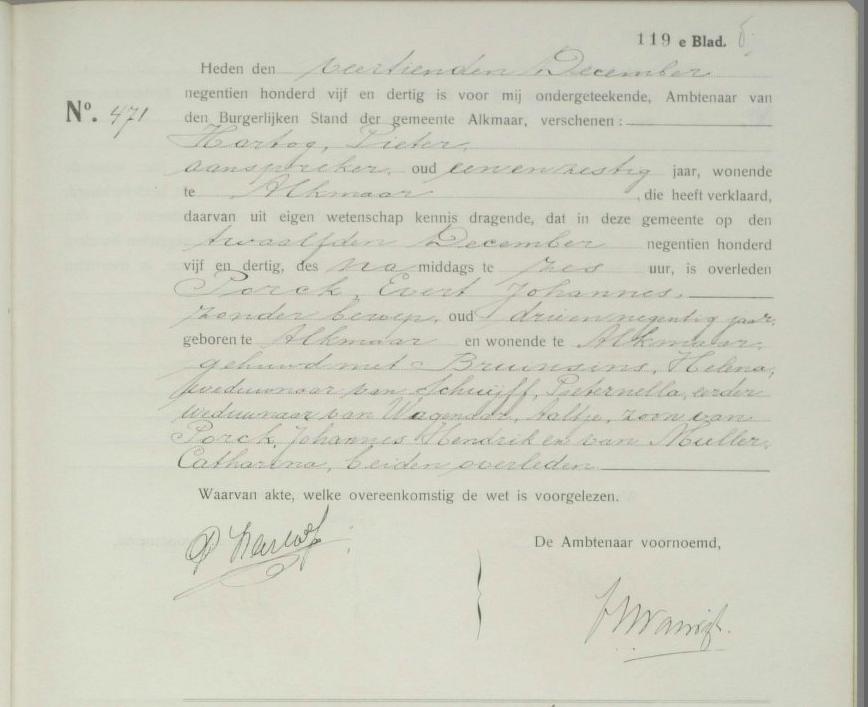 | Evert Johannes Porck | 5 juni 1842 | 183 | Alkmaar (N-H) | 6 | 12 december 1935 | 90 | 93 | Alkmaar (N-H) | M | YES | Y100 | R | ||||