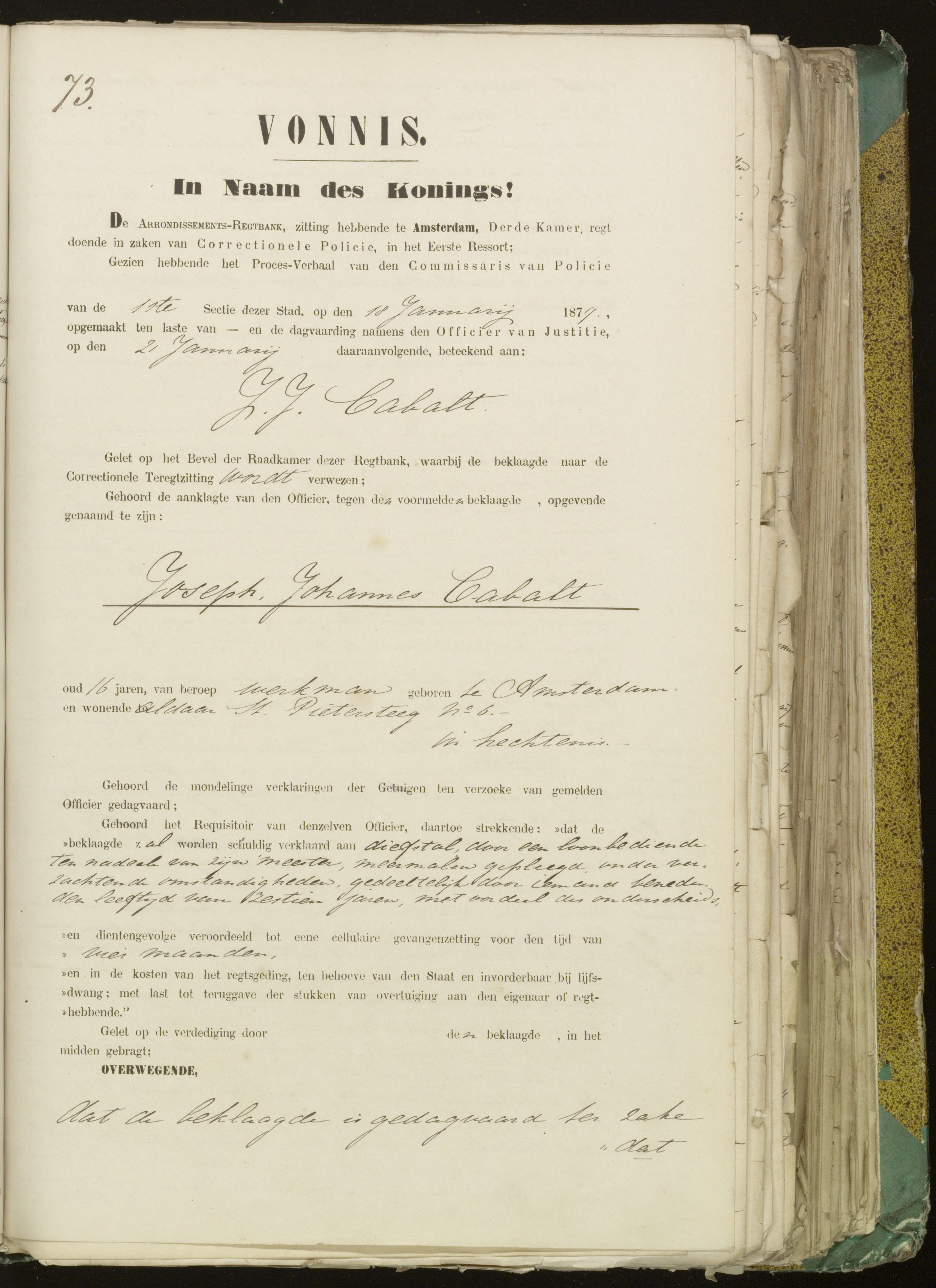 Arrondissementsrechtbank Amsterdam. Vonnis Joseph Johannes Cabalt 1879. 16 jaar