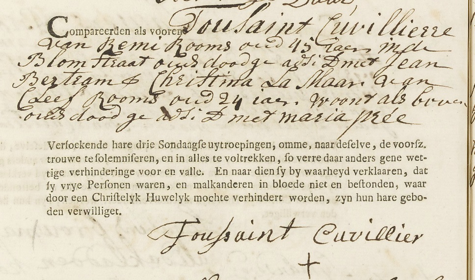 Ondertrouwakte Toussaint Cuvillier en Jeane Bertrams Christina La Maar 27-9-1765 Amsterdam